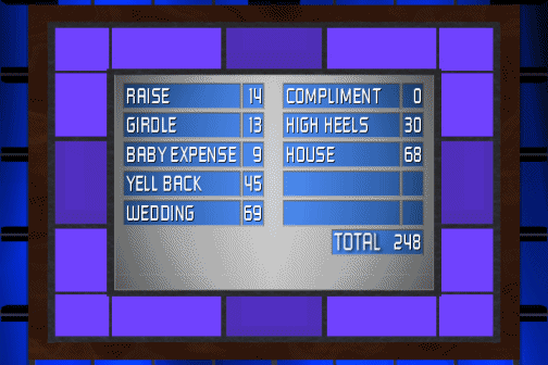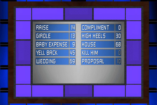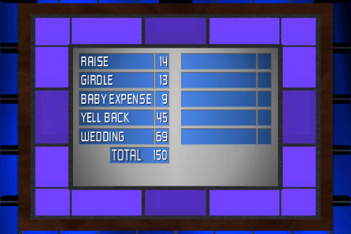 Questions What does a really nice boss give his secretary on Secretary's Day? Name something women wear that men think would be uncomfortable. Name something newlyweds save for. Name something you could do when your boss yells at you. Name an occasion when a man might be especially nervous. Jon's Answers/Scores